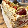 100% cream cheese cake with short crust base. Topped with melted bar one chocolate and melted caramel with hazelnuts.